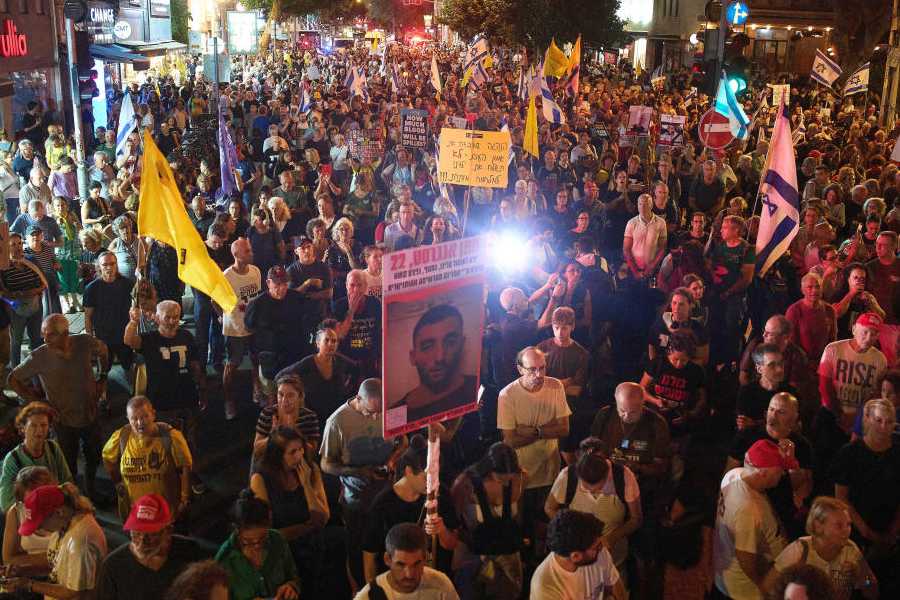 Demonstrators march in Tel Aviv, Israel, on Tuesday, Sept. 30, 2025, calling for the immediate release of all hostages held by Hamas in the Gaza Strip and an end to the ongoing war. AP/PTI
