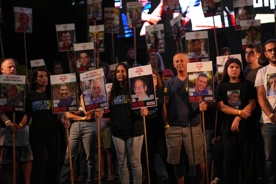 People take part in a rally demanding the returning of the bodies of hostages kidnapped by Hamas who are still in Gaza Strip, at a plaza known as hostages square, in Tel Aviv, Israel, Saturday, Oct. 18, 2025. AP/PTI