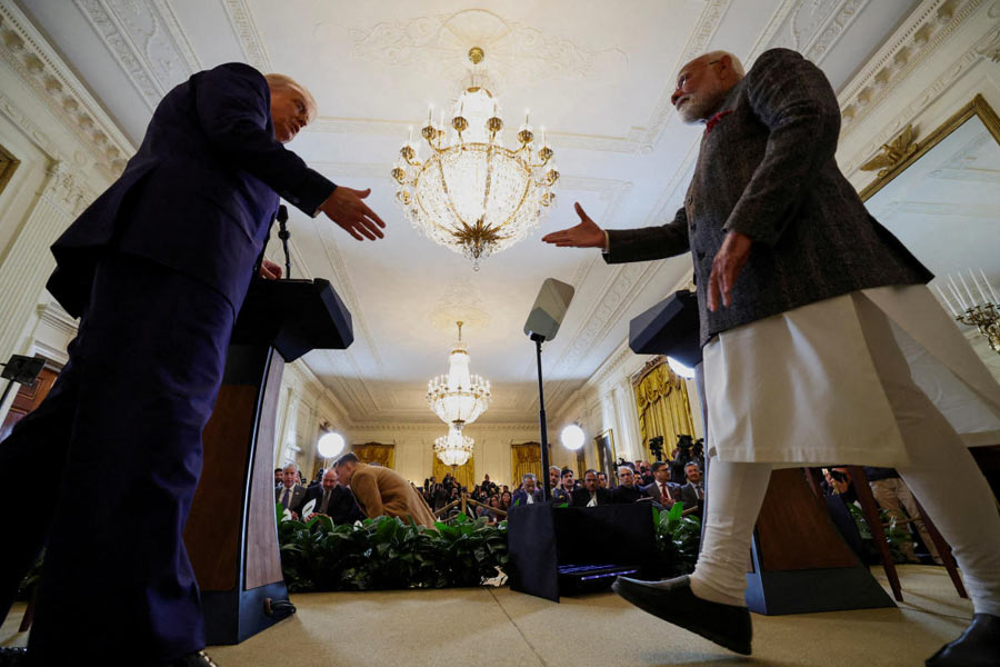 FILE PHOTO: U.S. President Donald Trump and Indian Prime Minister Narendra Modi prepare to shake hands as they attend a joint press conference at the White House in Washington, D.C., U.S., February 13, 2025. Reuters