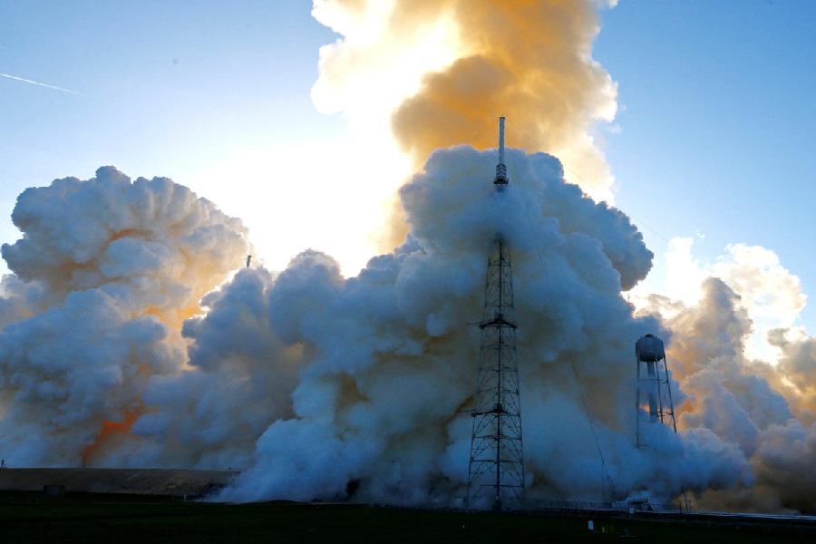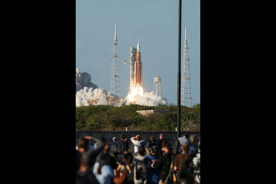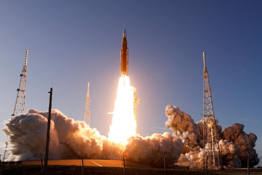 NASA's Space Launch System (SLS) rocket, topped with its Orion crew capsule, roared to life just before sunset at the agency's Kennedy Space Center in Cape Canaveral, Florida, carrying its debut crew - three U.S. astronauts and a Canadian astronaut - into Earth orbit. The 32-story-tall space vehicle thundered into clear skies trailing a towering column of thick, white vapor.
