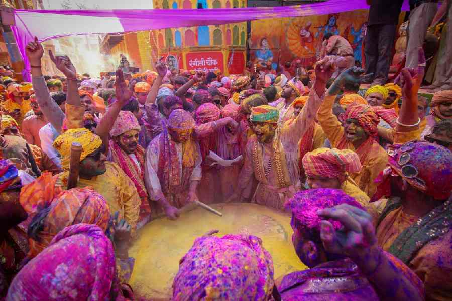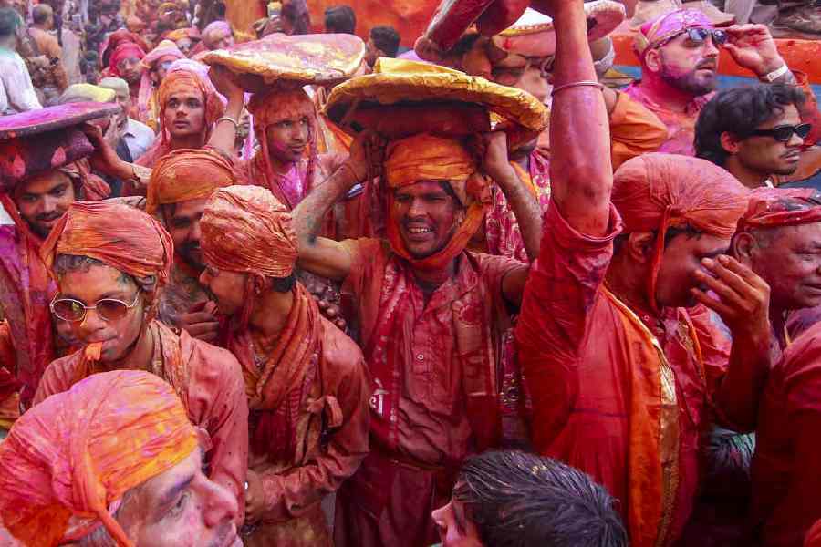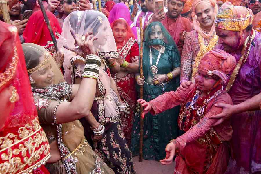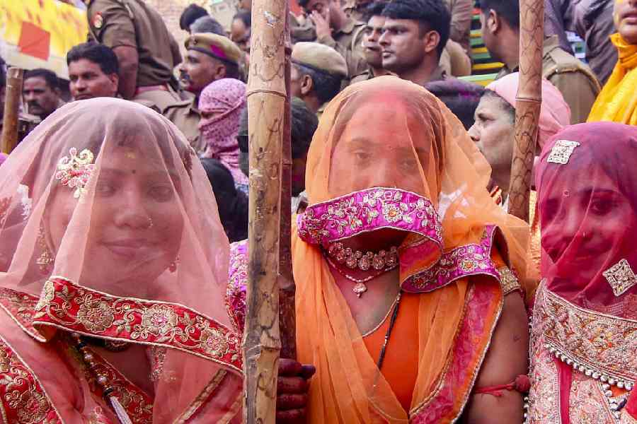 Around 5 pm, women of Barsana stepped out of their homes to play Lathmar Holi with men (huriyars) from the neighbouring Nandgaon town in the ritualised spectacle symbolising divine love and playful banter.