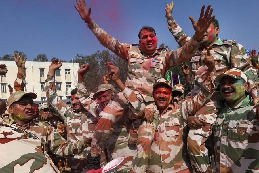 Indo-Tibetan Border Police (ITBP) personnel celebrate the Holi festival, in Kathua district, Jammu and Kashmir, Wednesday, March 4, 2026. (PTI)