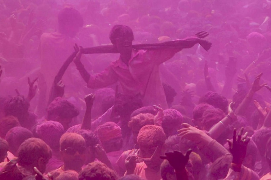 In Mathura, Holi was observed outside the Bankey Bihari Temple, but not inside the sanctum.