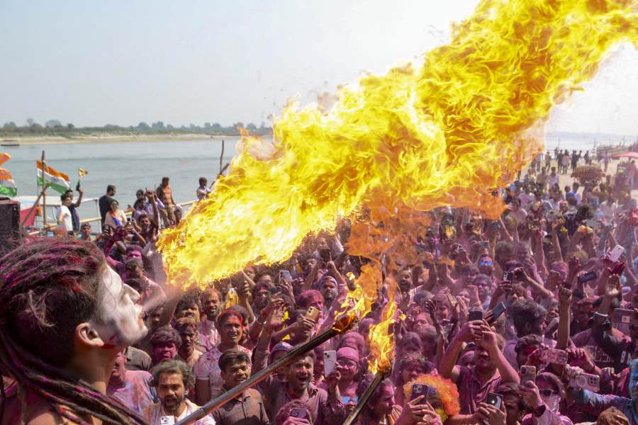A man performs with fire as people celebrate the Holi festival at the Anandeshwar Temple at Parmat Ganga Ghat, in Kanpur, Uttar Pradesh, Wednesday, March 4, 2026. (PTI)