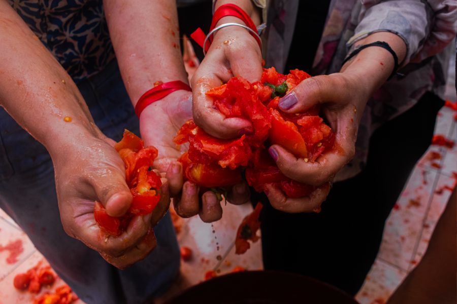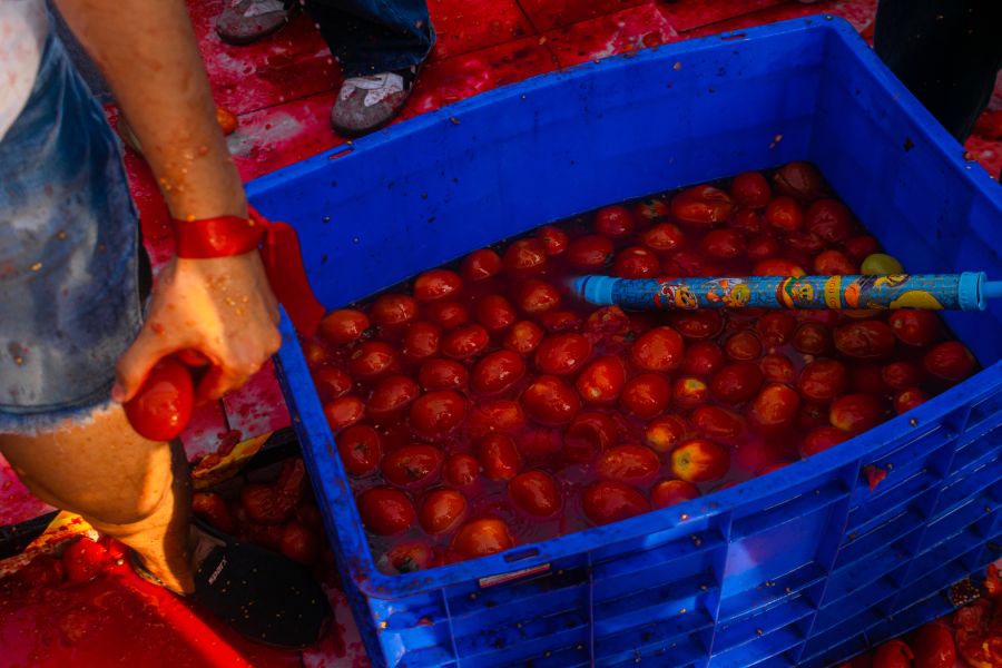 Participants squashed buckets of overripe tomatoes before throwing them, following the essential rule: “Squish before you throw.” Water guns were later filled with diluted tomato pulp and sprayed into the throng.