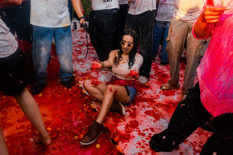 Revelers throw squished tomatoes at each other.