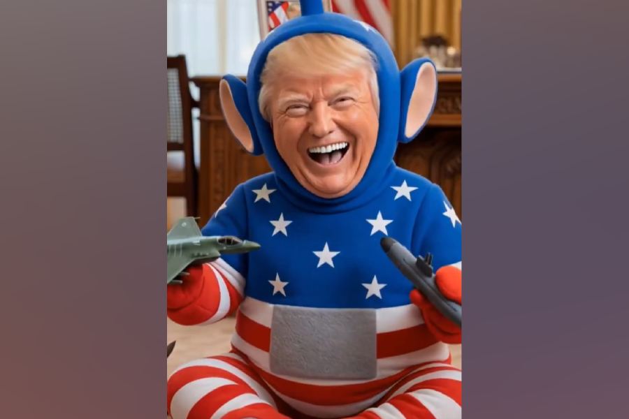An Epstein-like figure in a prison jumpsuit appears alongside them. In a different video, Trump is shown dressed like a character from Teletubbies. He kneels and asks European leaders for help. They respond with “No, no, no.”