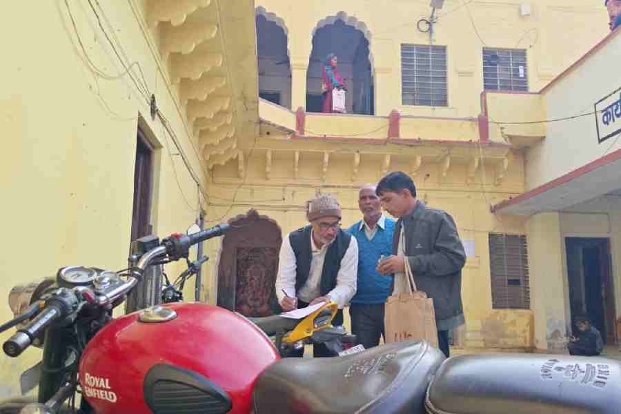 From left, Radheyshyam Shuklawas, Gyarsi Lal Arye and Kailash Yadav outside the Kotputli SDM office.