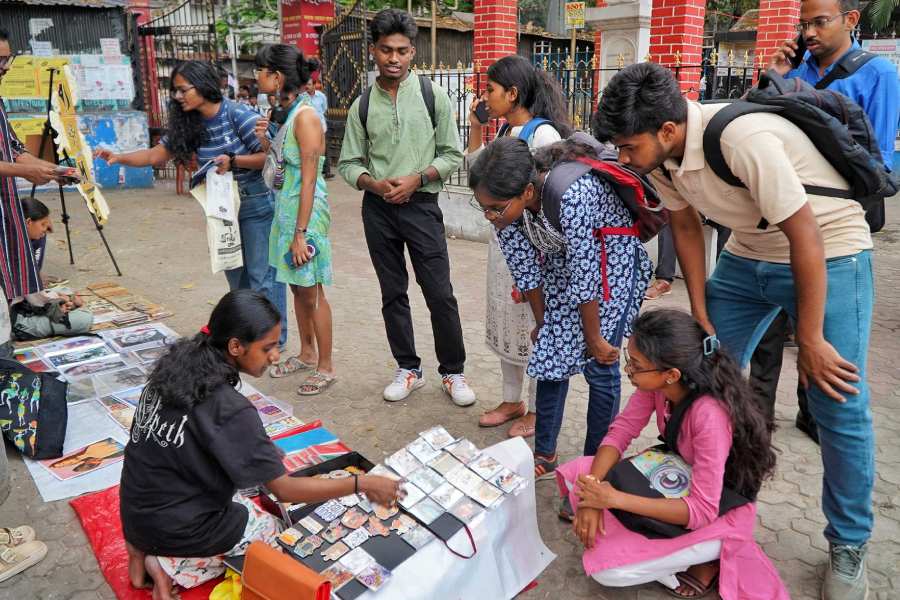 Decked in soft fairy lights, the premises offer a cosy setting where bibliophiles can flip through Bengali classics at the book stalls while browsing a range of Kolkata-themed collectibles — from bookmarks and fridge magnets to posters inspired by Bengali films and the city’s iconic lanes.