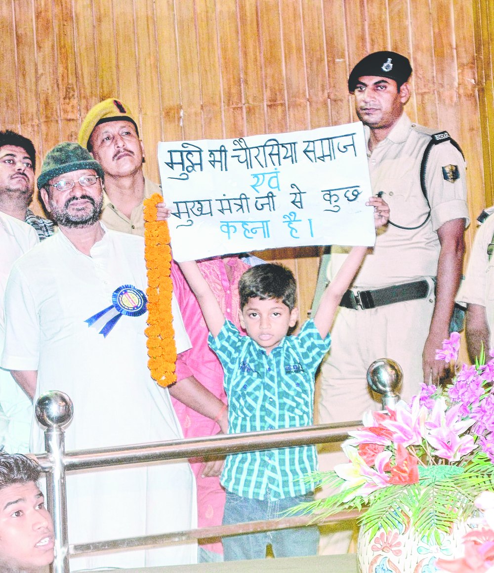 The occasion was a conference for people of the Chourasia caste, generally into betel trade, at the S K Memorial Hall here. Before Nitish's arrival, the boy, Kumar Raj Chourasia, was seen roaming around with a placard requesting participants and the chief minister to allow him to speak. As soon as Nitish entered the hall, the boy rushed towards the dais with the placard, before security personnel stopped him.