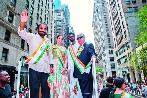 Super 30 founder Anand Kumar with Bahubali stars Tamannaah Bhatia and Rana Daggubati at the India Day parade in New York, the Indian diaspora's showpiece event in the Big Apple, on Sunday.