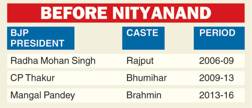 Throughout the Nitish-led NDA rule, the BJP had upper-caste members as its state presidents (see chart). Nityanand replaced Pandey on December 1, heralding a new order. In effecting the "new order", the BJP-RSS's high command seems to have sidelined the "old order" leaders belonging to backward classes. For example, former deputy chief minister Sushil Kumar Modi was the BJP's face for a long period of time during the Vajpayee-Advani era. But he now seems to have been driven to the periphery. Same is the case with Nand Kishore Yadav, the party's Yadav face for long.