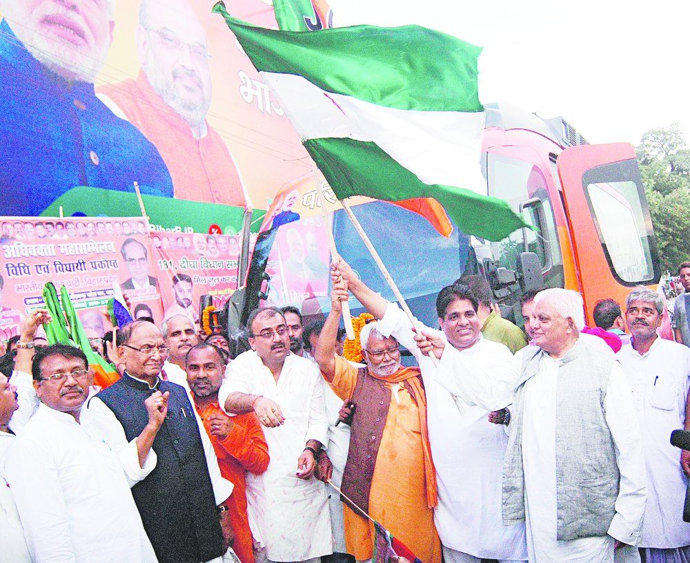 NDA leaders flag off parivartan raths (campaign vehicles) from the state BJP office on Tuesday. Picture by Ashok Sinha