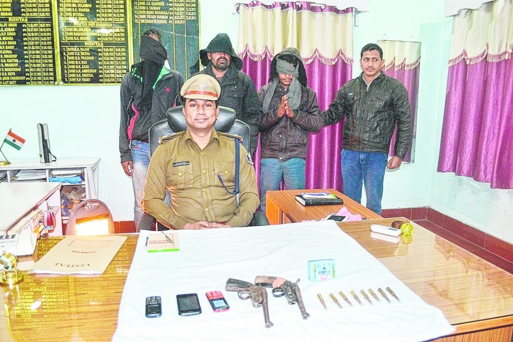 Rohtas SP Chandan Kumar Kushwaha with the arrested contract killers on Monday. Picture by Sanjay Choudhary