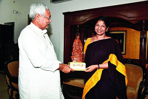 Rajya Sabha MP and M Karunanidhi's daughter Kanimozhi with chief minister Nitish Kumar and RJD boss Lalu Prasad in Patna on Friday to invite them to the DMK chief's 94th birthday celebrations in Chennai next month. Kanimozhi first met Nitish at 1 Aney Marg for lunch where the chief minister gifted her a small replica of the new Mahatma Gandhi statue in Gandhi Maidan. Next, she went to 10 Circular Road to see Lalu. "I have come here to meet Nitish Kumar and Lalu Prasad to invite them to the 94th birthday celebrations of my father in Chennai on June 3," she told journalists outside Lalu's residence. She handed the leaders the invitation card on behalf of her brother MK Stalin, the DMK's working president. Lalu said: "I will go to Chennai with a big bouquet, her father has always fought for social justice. It's my privilege that his daughter came to Patna to extend a personal invitation." Rabri Devi was also present when the DMK Rajya Sabha MP met Lalu.
