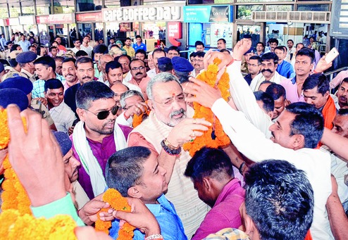 Patna: Union minister Giriraj Singh on Saturday received a grand welcome at Patna airport where his supporters raised slogans of "Shere-Bihar Zindabad".