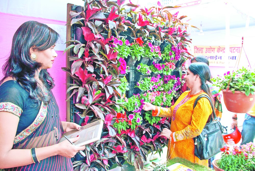 Residents check a hanging garden at the Bihar Mahila Udyog Mela on Monday. Picture by Jai Prakash