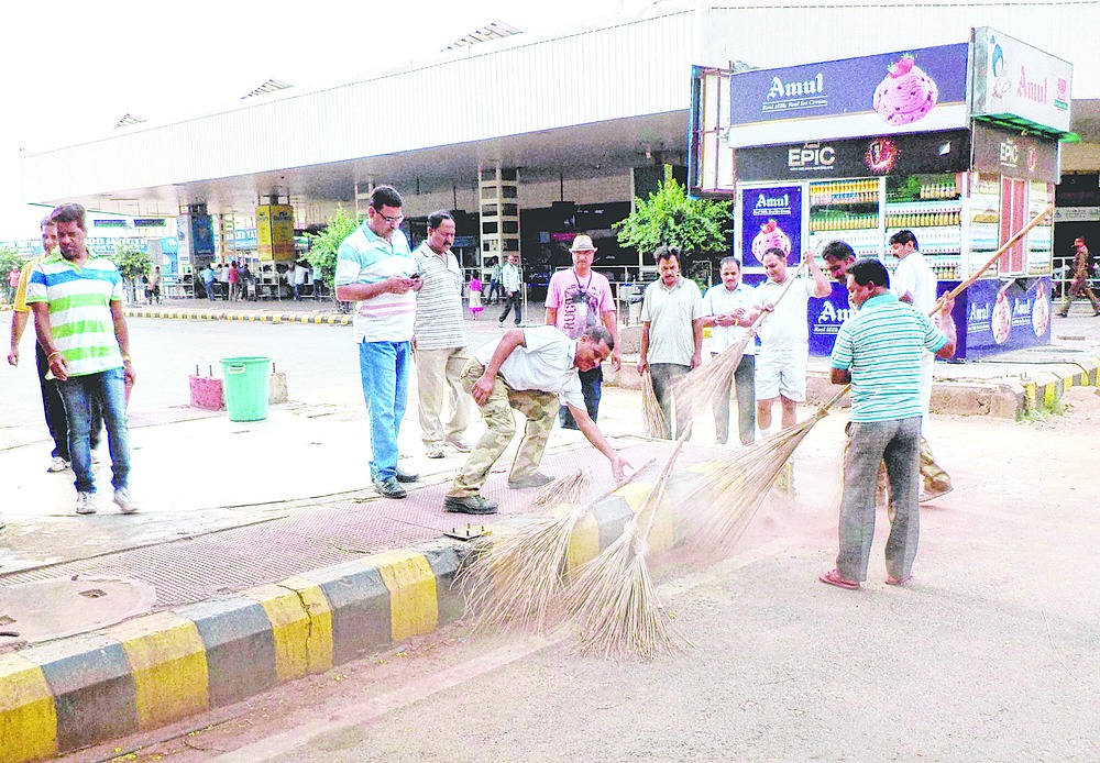 Airports Authority of India officials take part in a weeklong cleanliness drive under the Swachh Bharat Abhiyan at Jayaprakash Narayan International Airport on Thursday. "The drive has been initiated to make everyone at the airport - passengers and visitors -aware about cleanliness and hygiene. The terminal