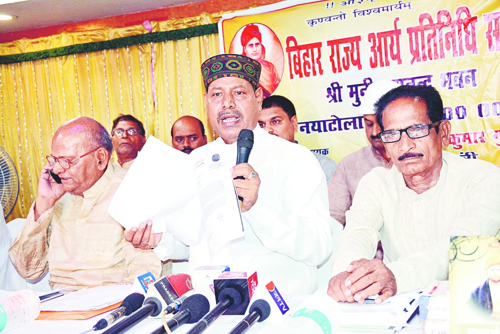 The legislator presented a sheaf of papers to journalists to bolster his claim as the head of the Bihar Rajya Arya Pratinidhi Sabha, including letters from various factions of Sarvadeshik Arya Pratinidhi Sabha, the supreme body that presides over Arya Samaj affairs.
