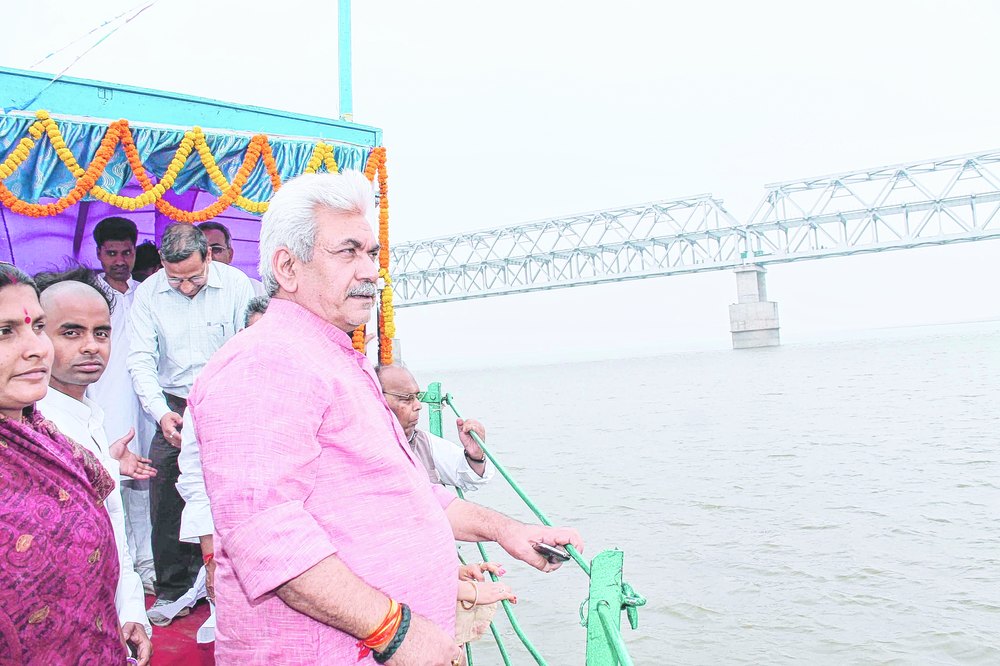 Minister of state for railways Manoj Sinha reviews construction work of the Rs 2363-crore rail-cum-road bridge on the Ganga in Munger on Monday. Satisfied with the progress, Sinha discussed land problems with the railway officials and public representatives who accompanied him on the review visit. The minister requested everybody present to help the Indian Railways solve land acquisition problems in construction of the approach road of the project, approved in the 1997-98 financial year. Sinha went around in a steamer on Monday morning to inspect the project's progress. He also inspected the northern end of the project site over the Ganga. He was accompanied by Munger MP Veena Devi, Begusarai MP Bhola Singh, former parliamentarian Surajbhan Singh, East Central Railway general manager AK Mittal, chief administrative officer LM Jha, Danapur divisional railway manager AK Gupta and Sonepur divisional railway manager Rajesh Tiwari.