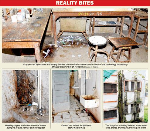 When The Telegraph visited the pathology laboratory of Guru Govind Singh Hospital on March 8, it saw wrappers of injections and empty bottles of chemicals strewn on the floor, giving it the look of a storeroom.