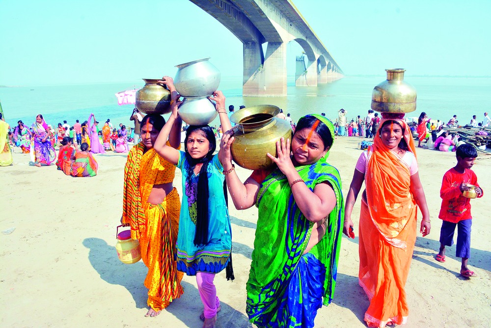 Devotees carry water from the Ganga on Nahay Khay - the first day of Chhath Puja - at Gai Ghat in Patna on Friday. Festive spirit gripped the city as thousands reached the ghats to take away water to prepare prasad. Devotees started gathering at the ghats from early morning (around 4am). Many of them came from far-flung areas to observe rituals on the banks of the holy river. Parvati Devi (50), a devotee from Masaurhi, who came with her family to observe the four-day rituals of Chhath at Kali Ghat, said: "Observing Chhath rituals on the riverbank has its own importance. So, our whole family has come. We