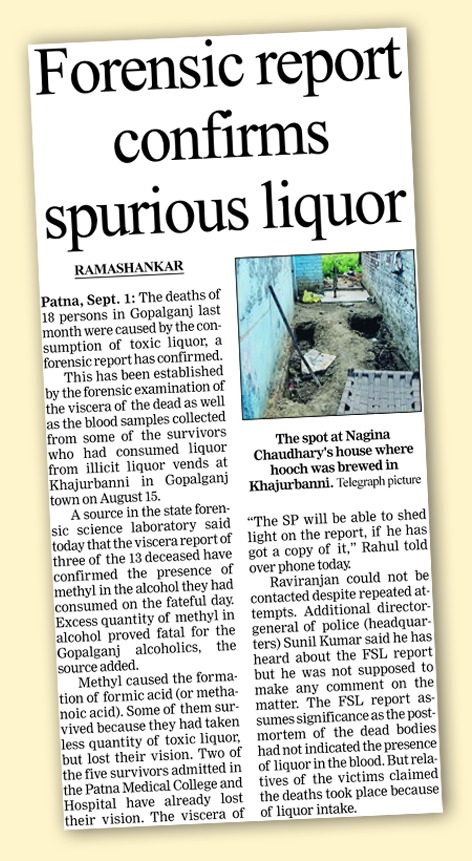 The viscera report of 11 persons who died after drinking hooch reached the chief judicial magistrate's court on September 1. A copy has been provided to the case's investigating officer, Nigam Kumar Verma. The report revealed contents of methyl and ethyl alcohol in the samples sent to the state forensic science laboratory (FSL) in Patna.