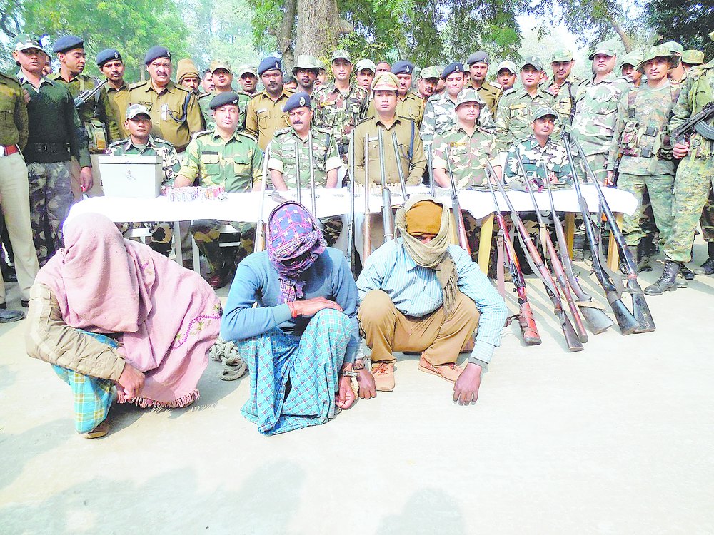 The arrested Maoists and seized weapons in Rohtas on Tuesday. Picture by Sanjay Choudhary