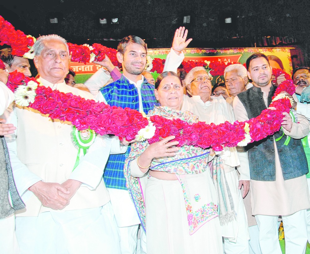 Lalu's car was showered with rose petals at nine places en route the venue of the meeting from his 10 Circular Road residence. His wife, Rabri Devi, and ministers sons Tej Pratap and Tejaswi accompanied him in the car.