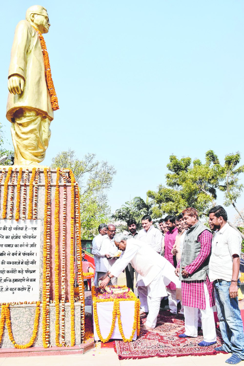 Chief minister Nitish Kumar offers floral tributes at the statue of socialist leader Dr Ram Manohar Lohia on his 105th birth anniversary at Lohia Udyan at Kankerbagh in Patna on Monday. At the state function, the chief minister arrived along with his cabinet colleagues, legislators and social workers.Those present on the occasion were food and consumer protection minister Shyam Rajak, former minister Bhola Prasad Singh, JDU MP Ramnath Thakur and MLC Sanjay Singh apart from social workers and prominent citizens.Tributes were paid to the great socialist leader across the state by organising functions. Artistes of information and public relations department also rendered patriotic songs on the occasion.In Lucknow, Uttar Pradesh Governor Ram Naik remembered Lohia as an "architect of opposition unity"."Lohia was a multi-faceted personality. I have a long association with him, he had contested the by-election from Goregaon Mumbai in 1963. He had the special capability of taking the opposition along," Naik said.