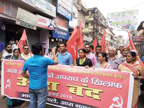 They raised slogans against chief minister Nitish Kumar for the deteriorating law and order in the state and also against the Bhojpur district administration. They demanded the arrest of the criminals and a compensation of Rs 10 lakh to the family members of the deceased, and treatment of the injured Tribhuan Gupta on government cost, a government job to one of the family members of the deceased and arms licence to the family for security reasons.