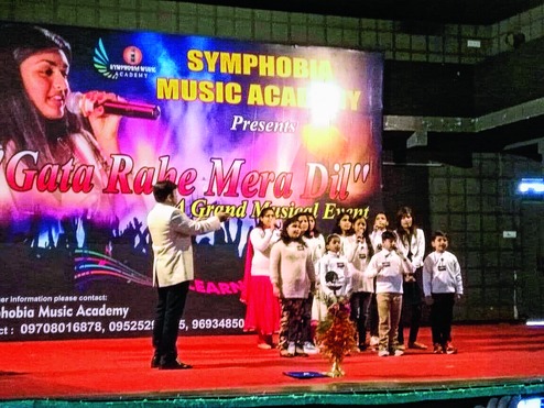Children perform at Gata Rahe Mera Dil, a musical programme organised by Symphobia Music Academy at Vidyapati Bhavan in Patna on Sunday.