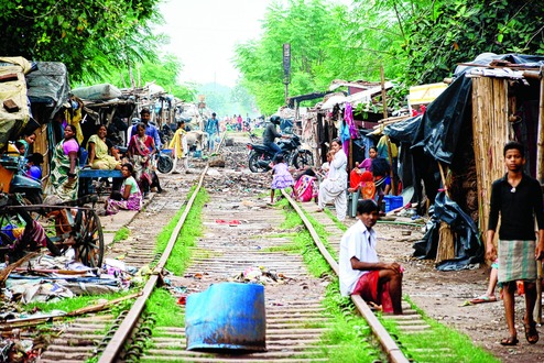 Slum dwellers sit on the tracks while a motorcyclist crosses it near Hartali Mor. Picture by Nagendra Kumar Singh