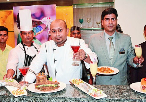 Hotel Panache chef Soumya Mukherjee (centre) presents a spread for a food festival in Patna starting Thursday. The attraction will be shawarmas, a Persian meat preparation where lamb, chicken or mutton are placed on a spit and then served inside a roti with other condiments. Manish Kumar, the manager (right), said the festival will run till June 18. Mukherjee said this is the first time in Patna when residents