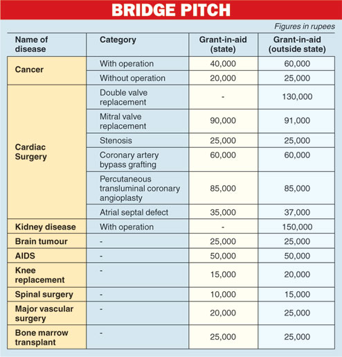 The grant-in-aid for hospitalisation within and outside the state starts from Rs 15,000, for knee replacement (see chart). It is also available for diseases like cancer, cardiac problems, kidney problems, brain tumour, AIDS, spinal surgery, bone marrow transplant and major vascular surgeries.