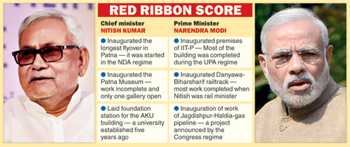 A heap of foundation stones and plaques greets the people of Bihar in the run-up to the Assembly polls. After Nitish and Modi crossed words over the Patna-Bakhtiyarpur rail project at a government function in Patna on July 25, the state is poised for another round of war of words with Modi suddenly changing his August 18 programme and going to Ara to lay the foundation stone of the long-awaited Ara-Patna-Buxar four-lane road and another rail bridge over the Ganga before going to Saharsa to address his third Parivartan rally.