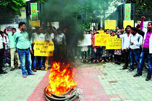 "When we were admitted, we were told the course was of four years with another six months of internship," said medical lab technology student Jai Prakash, one of the protesters. "But now we are being told that the course has been turned into a three-year one."