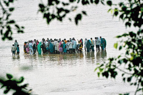 | Devotees perform pinddaan rituals in Falgu river in Gaya Tuesday. Picture by Suman |