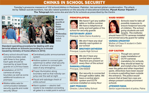 On Wednesday, The Telegraph did a reality check at the schools regarding implementation of all such security-related guidelines a day after the Peshawar attack, which left at least 130 children dead. It was found out that very few schools in the city have taken preventive security measures.