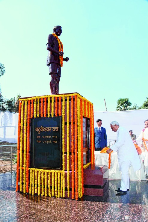 Chief minister Nitish Kumar pays floral tributes to revolutionary and freedom fighter Batukeshwar Dutt on his 107th birth anniversary here in Patna on Saturday. Dutt was a close associate of Bhagat Singh and both of them lobbed bombs in the then Central Legislative Assembly in New Delhi on April 8, 1929. He was awarded life term and was imprisoned at the Cellular Jail in Port Blair, but continued with the