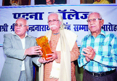 Patna College principal Nawal Kishore Chaudhary felicitates musician and alumnus Gajendra Narayan Singh on Tuesday. An alumnus of Patna College’s 1957-59 batch (history honours), Singh spoke on the state’s musical history at the felicitation ceremony organised in the seminar hall of the institution. He told the audience, comprising students and teachers of the institution, about features of the various musical gharanas of Bihar such as Bettiah, Dumraon and Darbhanga, and stressed on the need to revive the state’s music.
