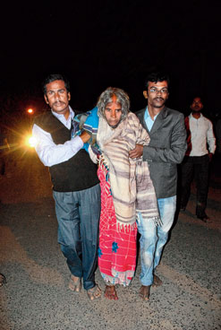 | Two men escort an elderly during the stampede at Adalat Ghat in 2012. Telegraph picture |