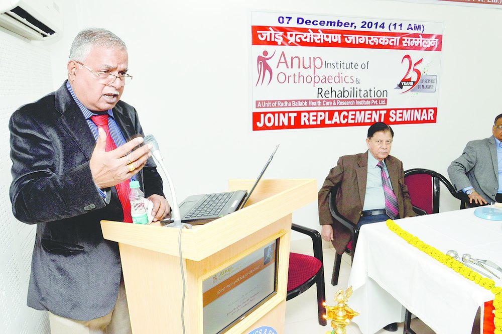 Orthopaedic surgeon Dr RN Singh addresses the seminar on joint replacement surgery at Anup Institute of Orthopaedics & Rehabilitation in Patna on Sunday. Singh, who is also the founder of the institute, said: 'There is still lack of awareness among people about joint replacement surgery. The body of a person becomes weak and the bones also start losing their strength with the increasing age. A person develops problems in walking when his joints become weak. This condition is known as arthritis. Joint replacement surgery is the best available solution for arthritis. Most of the people who have undergone joint replacement surgery have overcome such problems.' Dr Ashish Singh, a doctor at Anup Institute of Orthopaedics & Rehabilitation, said people should get their joint replacement surgery done only in hospitals where there is a good operating theatre and an expert team of doctors. Text by Shuchismita Chakraborty, picture by Ranjeet Kumar Dey