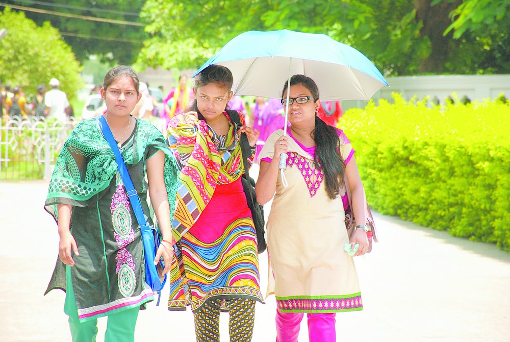 Students walk with umbrellas at Patna Women's College on a hot and sultry Tuesday. The maximum temperature hovered around 34° Celsius and the relative humidity between 61 and 73 per cent on Tuesday. The Met office has forecast light rain in the city over the next three days. Picture by Ashok Sinha