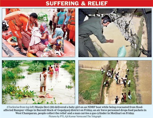An NDRF team saved 15 people trapped in Bihra village in Sitamarhi district last evening. Today, another NDRF team evacuated a pregnant woman, Manju Devi, from Rampur village in Gopalganj district. She delivered a baby girl on the boat. Later, the mother and the newborn were safely shifted to a nearby government hospital in Barauli (Gopalganj).