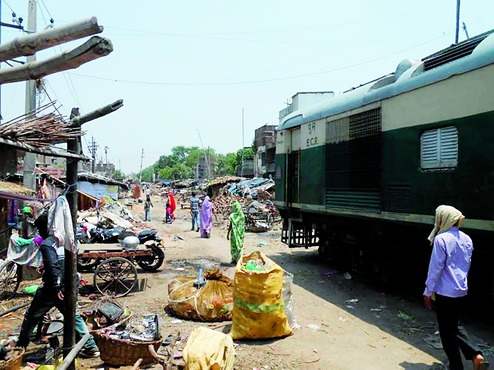 Passengers find it extremely difficult to board the train and disembark because of the encroachments on either side of the station. The track, almost buried by multiple layers of soil, runs cheek by jowl with shanties and heaps of garbage.