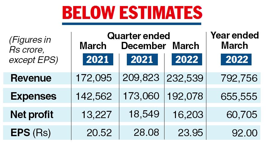 Brokerages had forecast net profit between Rs 16,300 crore and Rs 16,900 crore. The consensus estimate of Bloomberg analysts put the net profit at Rs 16,819 crore. Consolidated revenues for FY22 rose 47 per cent to Rs 792,756 crore ($104.6 billion) against Rs 539,238 crore a year ago. Net profits rose 26 per cent to Rs 67,845 crore from Rs 53,739 crore in 2020-21. Net profit attributable to owners of the company rose to Rs 60,705 crore in FY 2022.