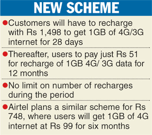 To get this benefit, Airtel customers will have to recharge with Rs 1,498 against which they will get 1GB of 4G or 3G mobile internet use valid for 28 days, the company said in a statement.