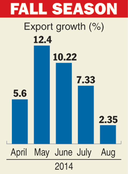 New Delhi, Sept. 15: Export growth slipped to a five-month low of 2.35 per cent in August at $26.95 billion, throwing a serious challenge to the Narendra Modi-government, which will soon announce its maiden trade policy.