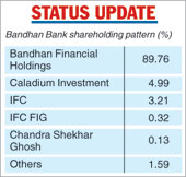 While Bandhan Financial Holdings has a 89.76 per cent stake in the bank now, Caladium Investment holds 4.99 per cent, IFC 3.21 per cent and IFC FIG 0.32 per cent. The rest is held by Ghosh (0.13 per cent) and Sidbi (0.32 per cent).